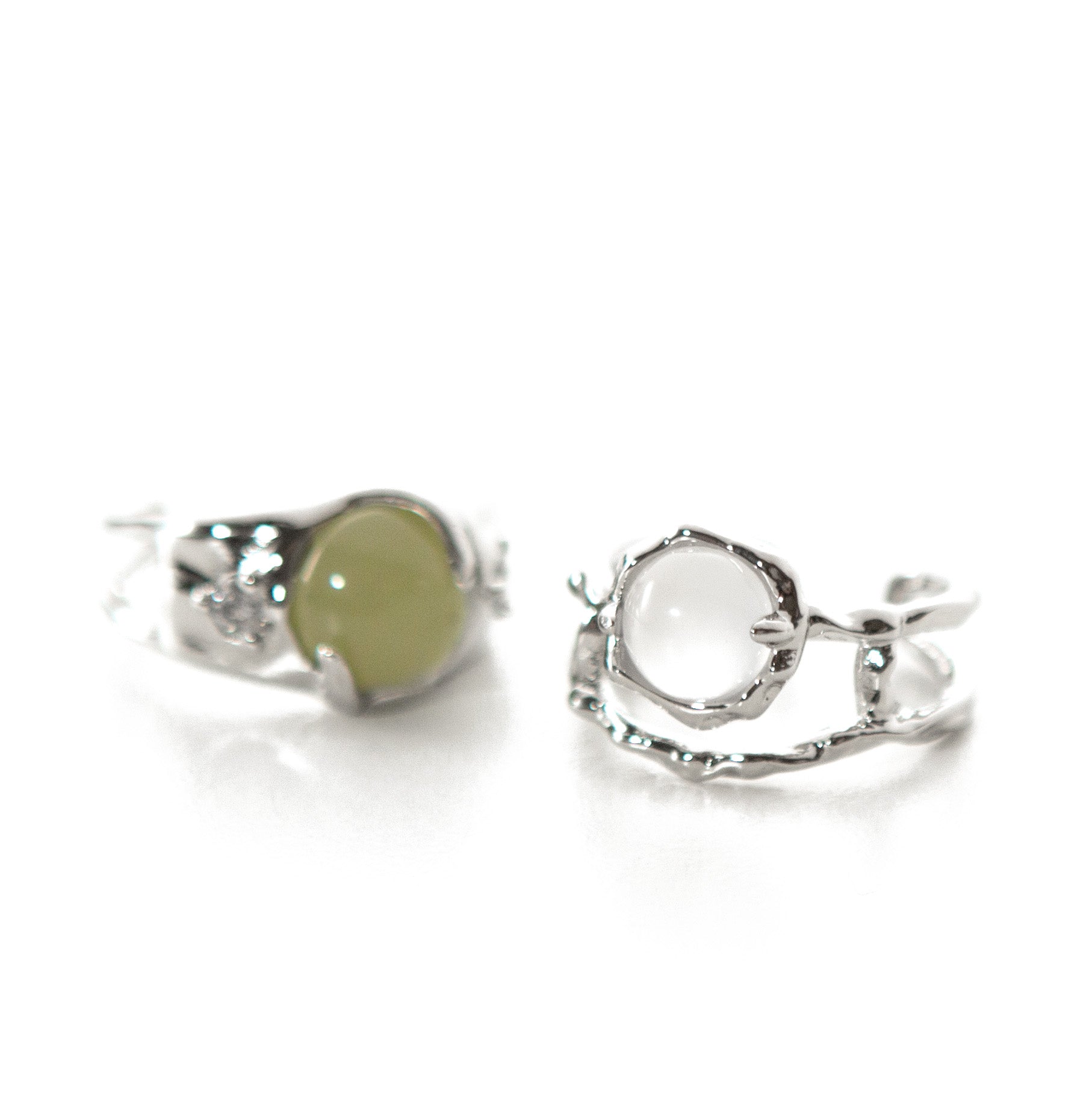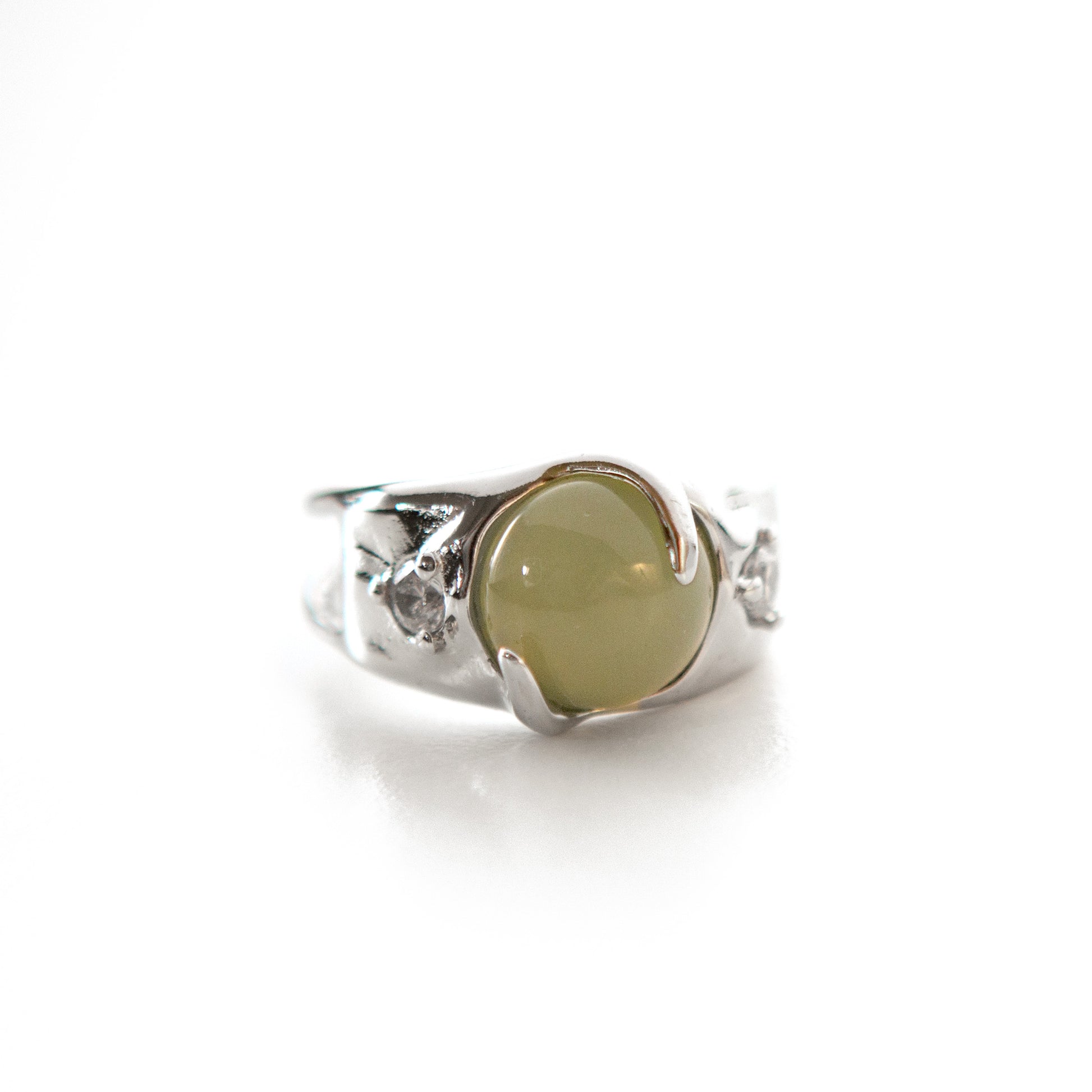 Introducing Jade - a bold statement ring, designed to captivate attention and elevate your look. At its heart sits a large cultured jade, cradled by settings that embrace it like loving arms, exuding a sense of strength and beauty. Adding a touch of sparkle and vibrancy are two small zircons nestled alongside the main stone, infusing the ring with an extra dash of allure and charm.