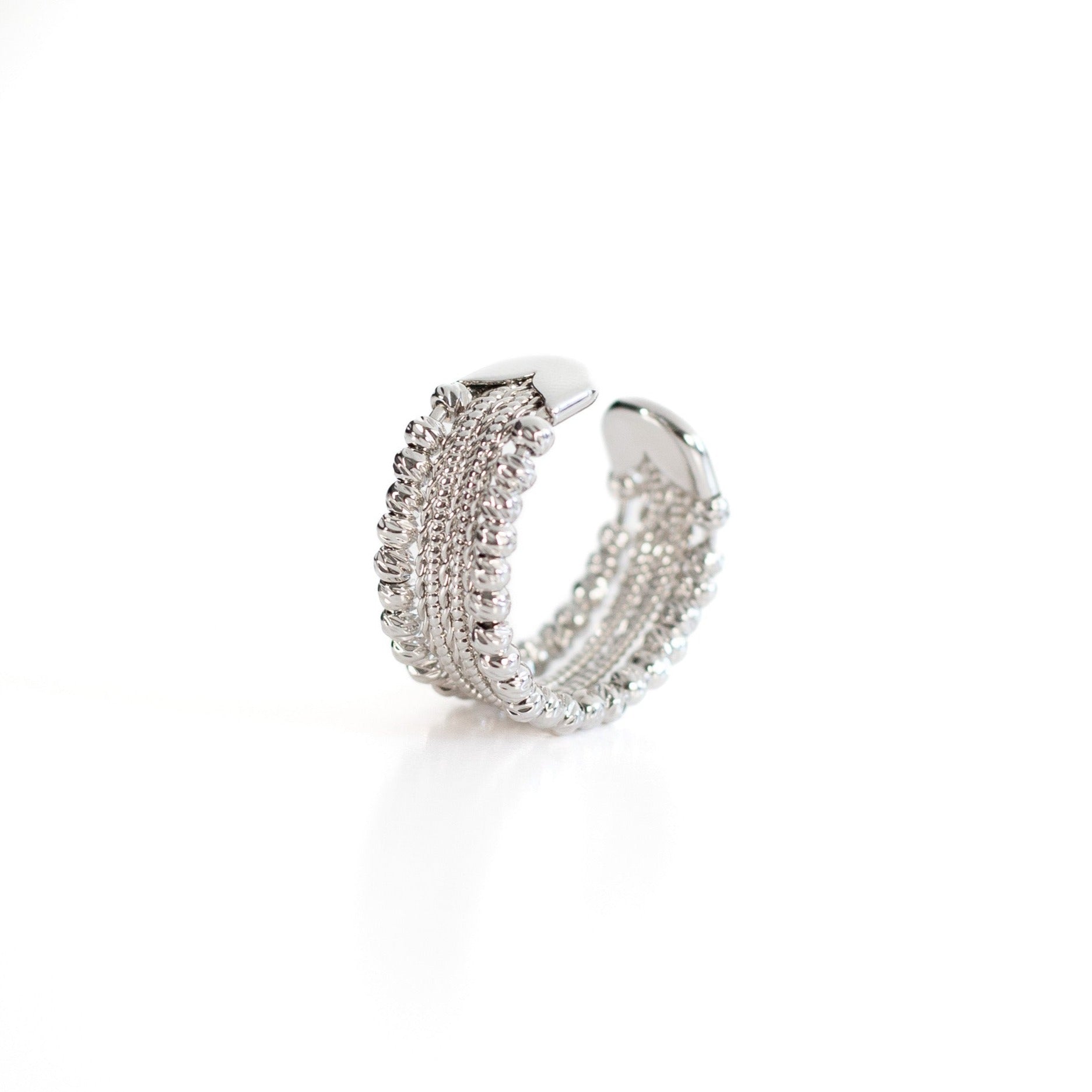 Melody is a true work of art! It's composed of five lines of silver beads in various sizes, strung together like circular musical notes dancing along lines. The silver beads are crafted using a pressing technique, allowing the entire ring to shine with enchanting brilliance at any time of day. This chunky ring is the perfect everyday statement piece, embodying a blend of sweetness and resilience, just like you!